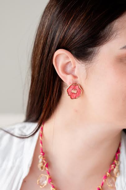 Brinco delicado com design orgânico em cores rosa, verde e nude para combinar com vários estilos.